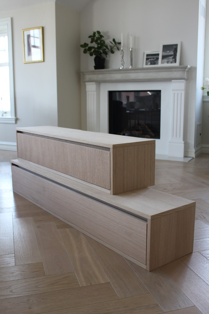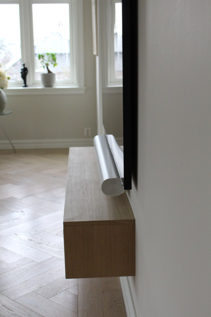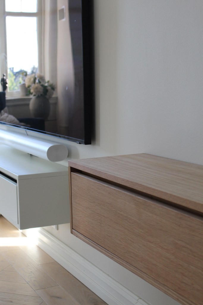 Madison vegghengt tv-benk i eik, med uttrekkbar skuff og demping. Tv-benken har et stilrent og funksjonelt design og er perfekt for oppbevaring av ledninger, kontrollbokser og modem. Signaler fra fjernkontroll og modem går fint gjennom stengt skuff. Tv-benken har utskjæringer på baksiden for ledninger, og en stor sammenhengende skuff. I størrelsen 180 cm har tv-benken to skuffer. Fester på baksiden for oppheng på vegg. Vi tilbyr fargene ubehandlet eik, hvitoljet eik, oljet eik, valnøtt og sort. Tv-benken leveres montert, og lagerføres i Oslo. Tv-benken kan også sendes med Posten for kr 690,–, uansett hvor i landet du bor. Bein til tv-benken kan kjøpes separat.