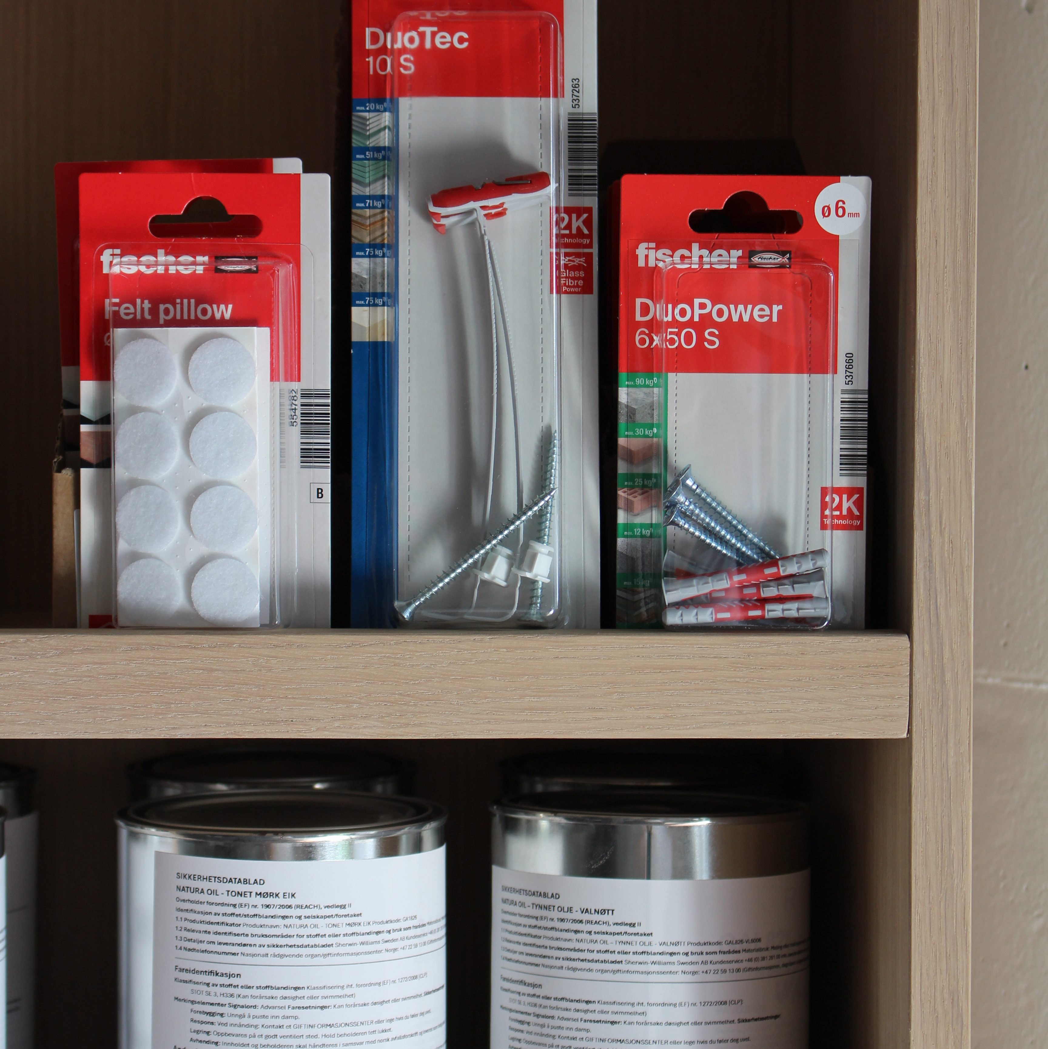 Vi er autorisert forhandler av Fischer skruer, kjent for sin styrke og pålitelighet. Disse passer perfekt til oppheng av våre TV-benker, uansett hvilket materiale veggen din består av. Vi selger også olje for etterbehandling av møbler.